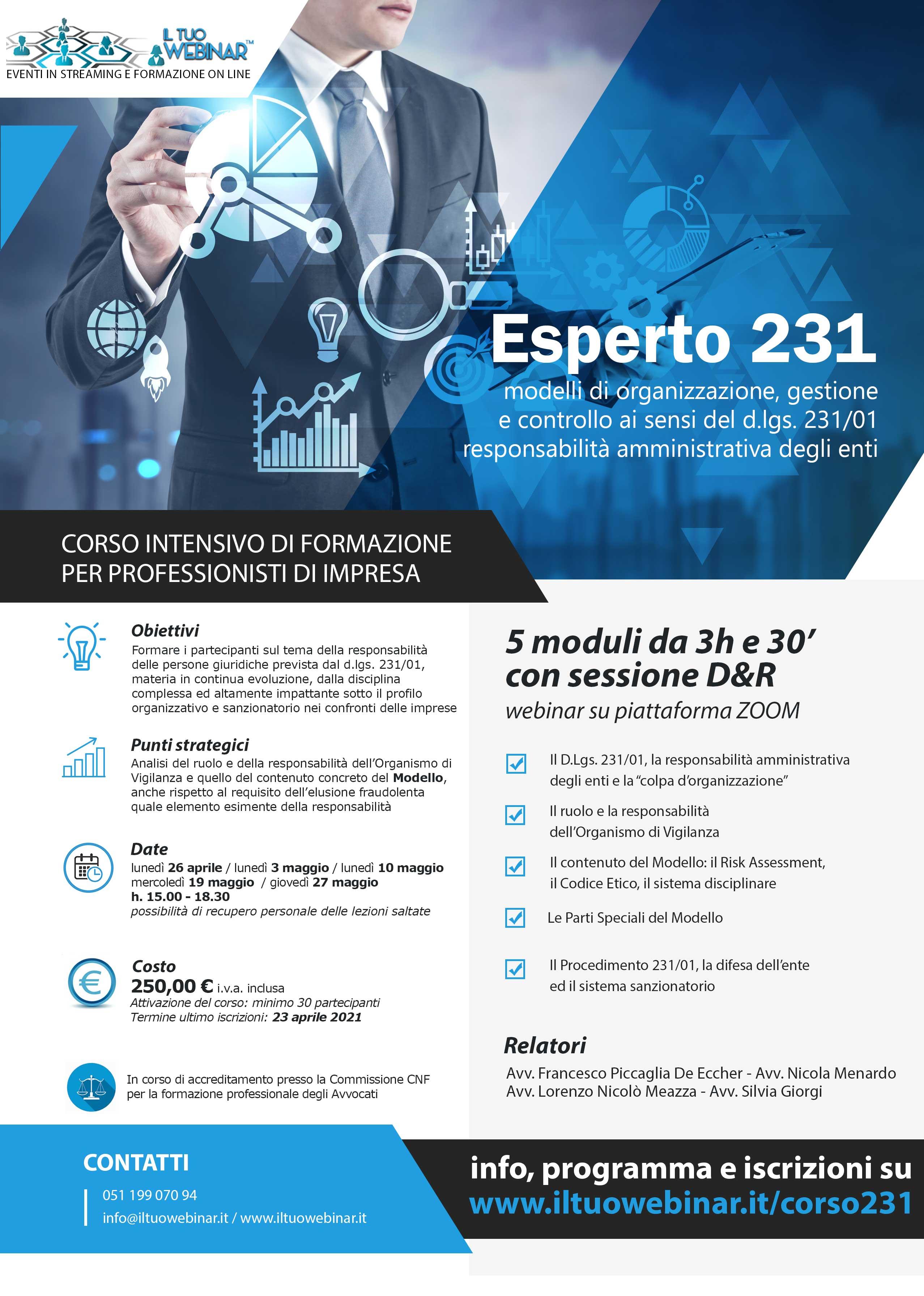 Programma 1° modulo - lunedì 26 aprile 2021 (h. 15.00-18.30) Il d.lgs. 231/01, la responsabilità amministrativa degli enti e la “colpa d'organizzazione” (F. Piccaglia De Eccher, N. Menardo, L. N. Meazza) - il d.lgs. 231/01, la responsabilità amministrativa degli enti e la “colpa d'organizzazione” - soggetti in posizione apicale e soggetti sottoposti a vigilanza e controllo - gli enti soggetti alla responsabilità 231/01 - la responsabilità dell'ente straniero e dei gruppi di imprese - l'interesse ed il vantaggio dell'ente - la continua evoluzione del “catalogo” dei reati presupposto - analisi di casi di giurisprudenza 2° modulo - lunedì 3 maggio 2021 (h. 15.00-18.30) Il ruolo e la responsabilità dell'Organismo di Vigilanza (F. Piccaglia De Eccher, N. Menardo) - il ruolo dell'Organismo di Vigilanza - la composizione, le caratteristiche, i flussi informativi, il piano di attività - l'attività di auditing, l'autonomia di spesa - le responsabilità dell'OdV - analisi di casi di giurisprudenza 3° modulo - lunedì 10 maggio 2021 (h. 15.00-18.30) Il contenuto del Modello: il Risk Assessment, il Codice Etico, il sistema disciplinare (F. Piccaglia De Eccher, L. N. Meazza) - il contenuto del Modello: il Codice Etico, la Parte Generale ed il sistema disciplinare - il procedimento di Risk Assessment - i rapporti del Modello con i Sistemi di Gestione – certificati e non – già presenti in azienda - il sistema di whistleblowing - analisi di casi di giurisprudenza 4° modulo - mercoledì 19 maggio 2021 (h. 15.00-18.30) Le Parti Speciali del Modello (F. Piccaglia De Eccher, N. Menardo, L. N. Meazza, S. Giorgi) - il catalogo dei reati presupposto - focus: i reati in materia di Sicurezza sul lavoro ed in materia Ambientale - focus: i reati in materia Tributaria - focus: i reati contro la Pubblica Amministrazione e Societari - focus: il disegno di legge n. 2427, recante «Nuove norme in materia di illeciti agroalimentari» - analisi di casi di giurisprudenza 5° modulo - giovedì 27 maggio 2021 (h. 15.00-18.30) Il Procedimento 231/01, la difesa dell'ente ed il sistema sanzionatorio (F. Piccaglia De Eccher, N. Menardo, L. Meazza) - il procedimento 231/01. Il Giudizio Ordinario ed i Riti Speciali - le misure cautelari applicabili all'ente - la costituzione di parte civile, la messa alla prova ed altre questioni aperte - le sanzioni applicabili all'ente in caso di condanna - il sistema sanzionatorio “per quote” - il requisito dell'elusione fraudolenta quale elemento esimente della responsabilità - le cause di esclusione dalla responsabilità degli enti e di riduzione delle sanzioni - analisi di casi di giurisprudenza Curricula relatori
